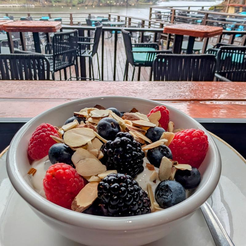 Organic Greek yogurt topped seasonal fruit and berries, almonds and local Honey Comb