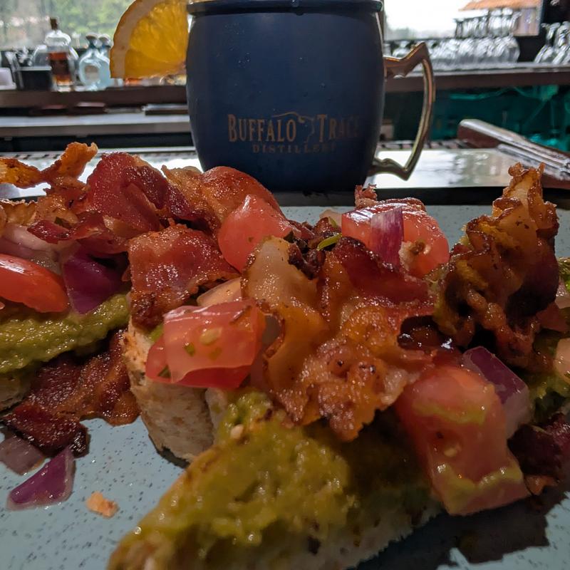 Grilled Multigrain toast topped with guacamole, bacon, Pico de Gallo and everything bagel seasoning