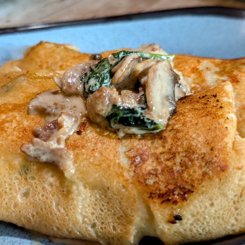 Two crepes stuffed with cream spinach, shaved prime rib, gruyere cheese andushrooms