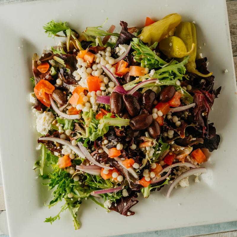 Feta cheese, red onion, tomato, pepperoncinis, kalamata olives, and couscous, served on top of a bed of spring mix, served with balsamic vinaigrette.