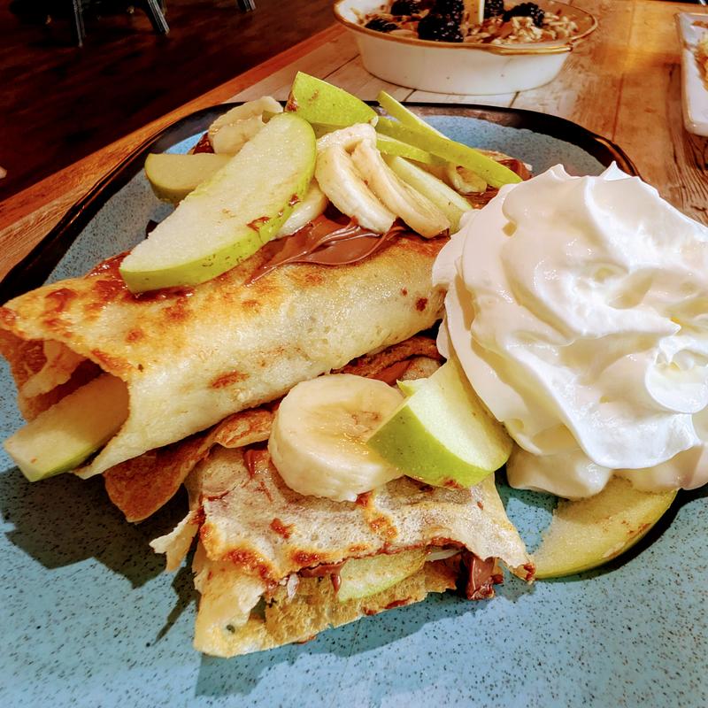 Two crepes with fresh mozzarella, Nutella, bananas, apples, and pan fried to gooey, crispy goodness