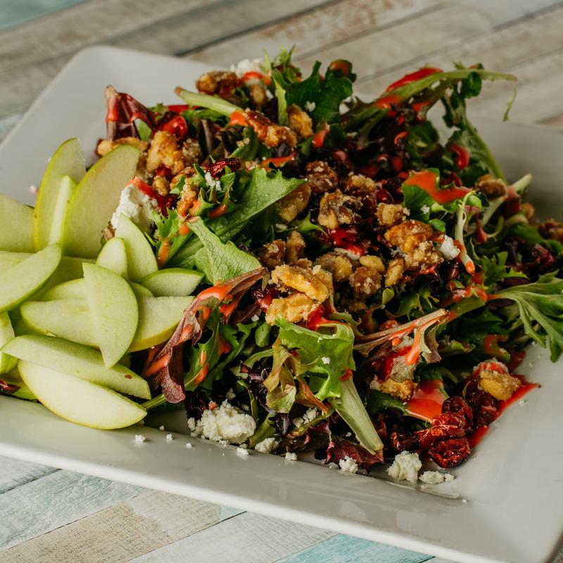 Feta cheese, craisins, sliced Granny Smith apples, and candied walnuts on top of a bed of spring mix, served with raspberry vinaigrette.
