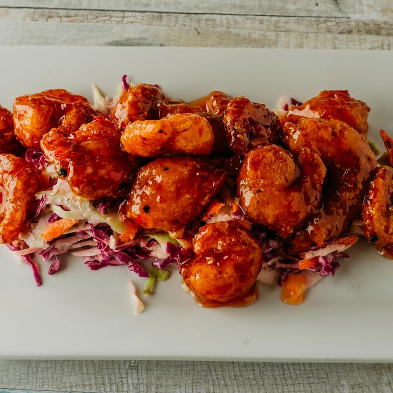 Fried shrimp, tossed in sweet chili sauce, served on coleslaw.