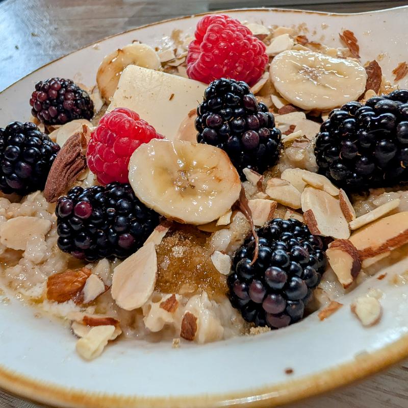 Butter, brown sugar, cinnamon, almonds seasonal fruit and berries