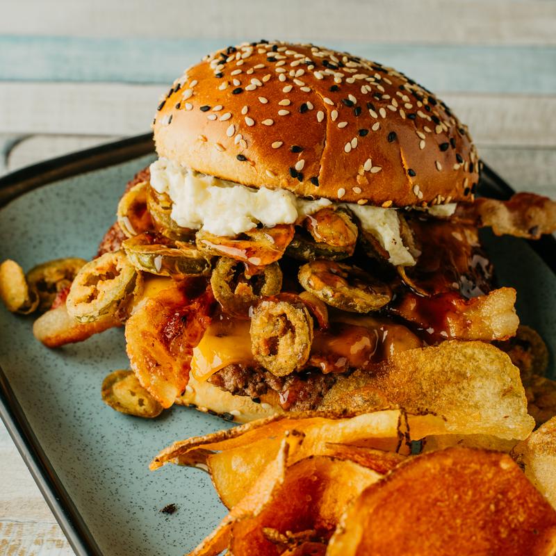 Cajun dusted, blue cheese topped patties, bacon, and haystacks.
