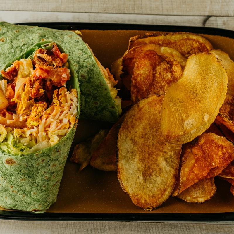 Romaine lettuce, red onion, tomato, shredded cheese, crisp buffalo chicken, and ranch dressing, served in a spinach tortilla.
