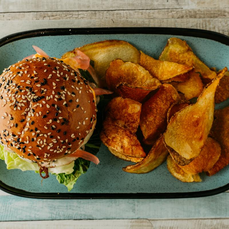 (*Contains eggs and dairy) • A homemade black bean burger patty, provolone cheese, romaine, tomato, pickled red onions, and chipotle mayo, served on a sesame seed bun.
