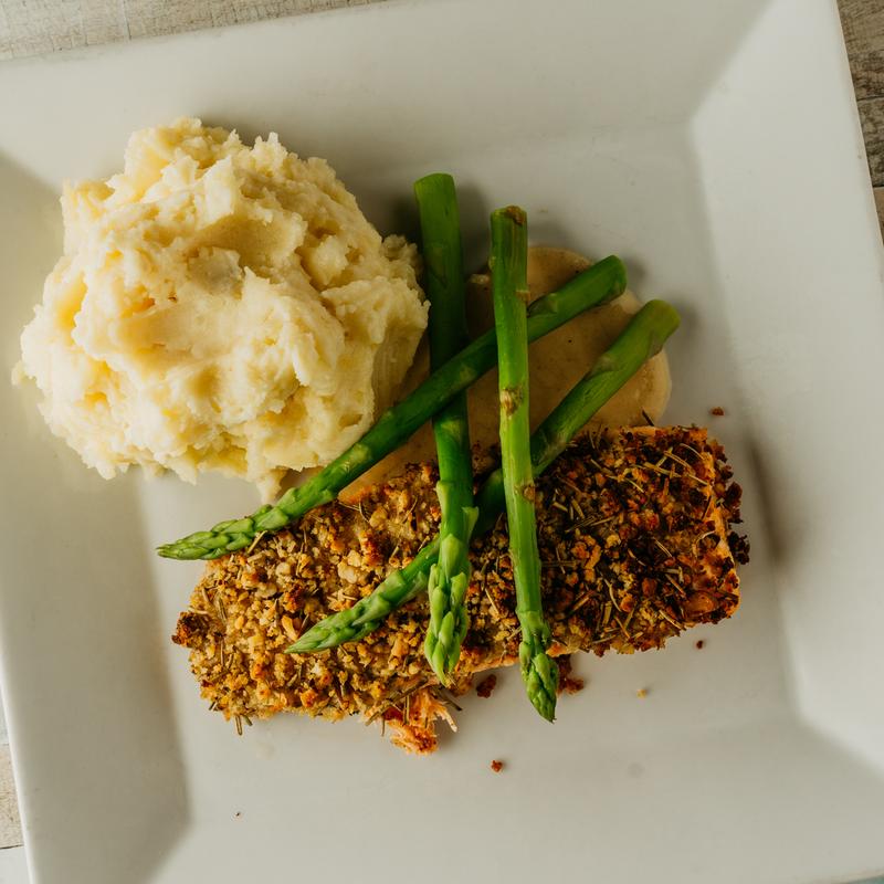 Chicken breast, pounded thin, breaded, and pan-fried, topped with an egg, capers, and horseradish sauce. Choice of mashed potatoes, brown rice medley, or asparagus.