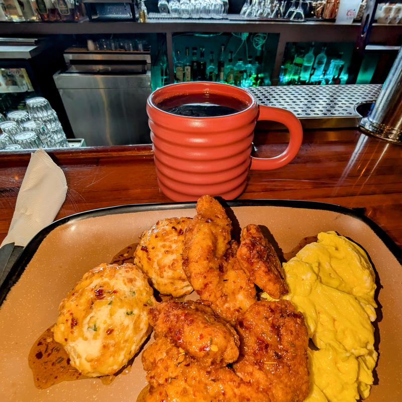Home made biscuits, fried chicken, scrambled eggs, drizzled with hot honey