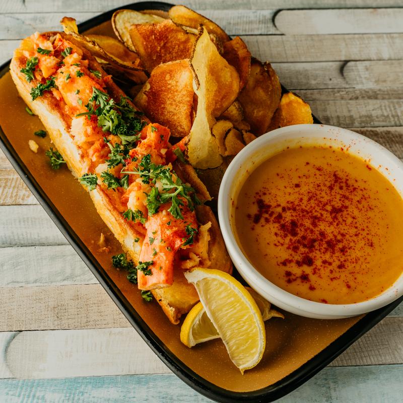 Buttery lobster in a homemade brioche roll served with lobster bisque and chips.